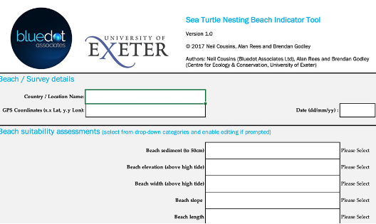 The Sea Turtle Nesting Beach Indicator Tool was developed by Bluedot in collaboration with sea turtle experts at the University of Exeter. It can be used to rapidly identify habitat suitability for nesting and the level of disturbance, helping to determine the potential for restoration of sea turtle nesting beaches.
